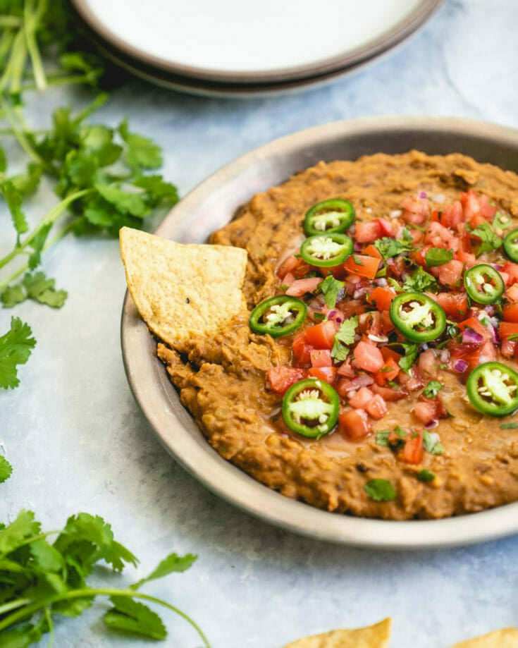 This refried bean dip is plant based but just as satisfying as a cheesy Mexican dip! You can use either homemade refried beans or canned refried beans, mixed with green chilis and cumin. Top it with salsa fresca and it's a healthy spin on a bean dip that's seriously satisfying.