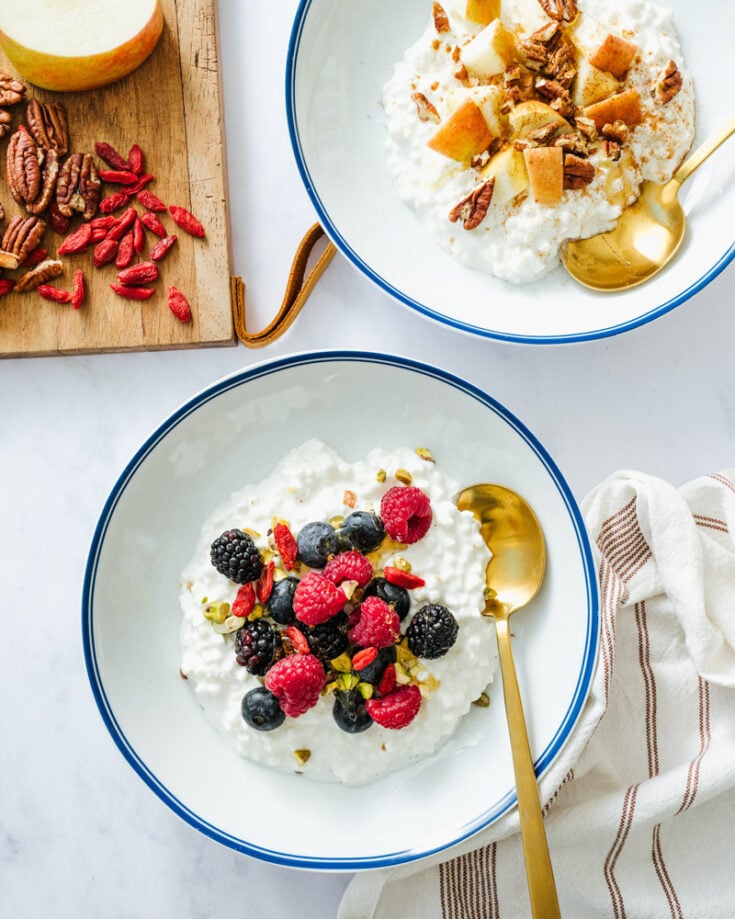 Here’s a healthy lunch idea that’s a bit unexpected, but surprisingly satisfying…Cottage Cheese Bowls! Sure, cottage cheese and pineapple or melon seems a little retro. So let’s dust off the concept and make a modern way to lunch. Top this high protein cheese with fresh berries or apple, cinnamon and drizzle of honey.