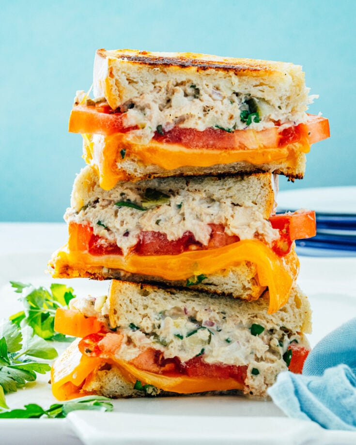 Want a good retro-style fast dinner? Try this classic tuna melt: it’s the stuff dreams are made of! Between crusty bread is sandwiched a creamy, savory mess of tuna and crunchy veggies so perfectly seasoned that you won’t be able to stop taking bites.