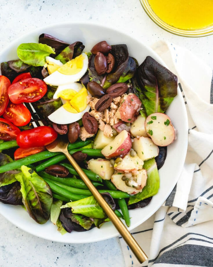 The word salad doesn’t even really come close to describing the taste treat that is the traditional French Nicoise salad. Hard boiled eggs, green beans, Kalamata olives, tomatoes, tuna, and tangy potatoes sit on crunchy lettuce with a zesty lemon vinaigrette that makes you want to keep eating it for days. It’s filling enough to be a main dish, and it’s got the best carefree vibe.