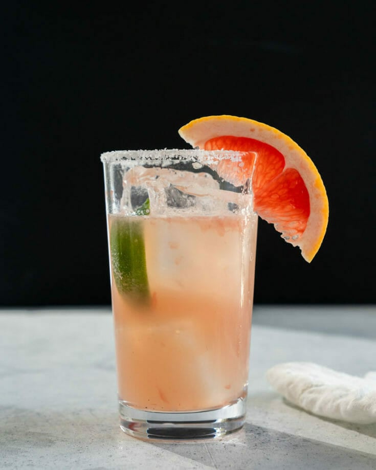 Cousin of the classic margarita, this easy cocktail recipe features tequila with grapefruit instead of lime! This simple drink is sweet tart and refreshing, and you don't even have to dirty a cocktail shaker. It’s perfect for happy hour drinks, or water it down and it could be a brunch drink too. The Paloma is traditionally made with grapefruit soda, but for an all natural spin this recipe uses grapefruit juice and soda water (and it’s easier to find!). Add a salt rim and you’re in business!