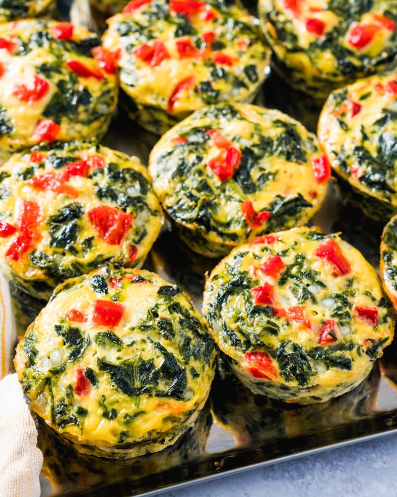 This egg muffin recipe is a spin on our Crustless Spinach Quiche. So if you prefer, you can make this recipe in a pie pan and slice into wedges. Simply bake it for 25 to 30 minutes until puffed and golden. Head to the linked recipe for more details!