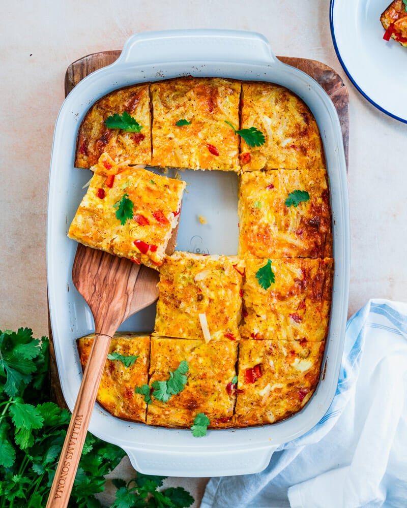 This hashbrown breakfast casserole recipe is delicious and easy to put together! It doubles as a vegetarian dinner and leftovers save well.
