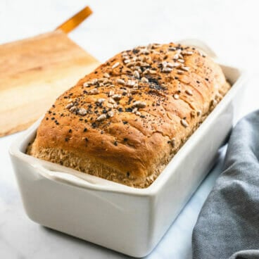 It’s truly easy compared to other bread recipes! This multigrain bread is made with some rye flour and has tasty mix-ins like oatmeal, sunflower seeds, and quinoa.