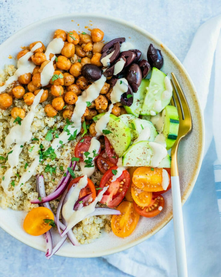These Mediterranean diet couscous bowls recipe is a common repeat in our dinner recipes repertoire. Why? In just 25 minutes, you have a fresh bowl of delicious vegetables that’s smothered in a tangy lemon tahini sauce. This one is a truly tasty way to eat your veggies. If you'd like, substitute couscous for a whole grain like quinoa or brown rice. It would also be tasty with Greek salad dressing.